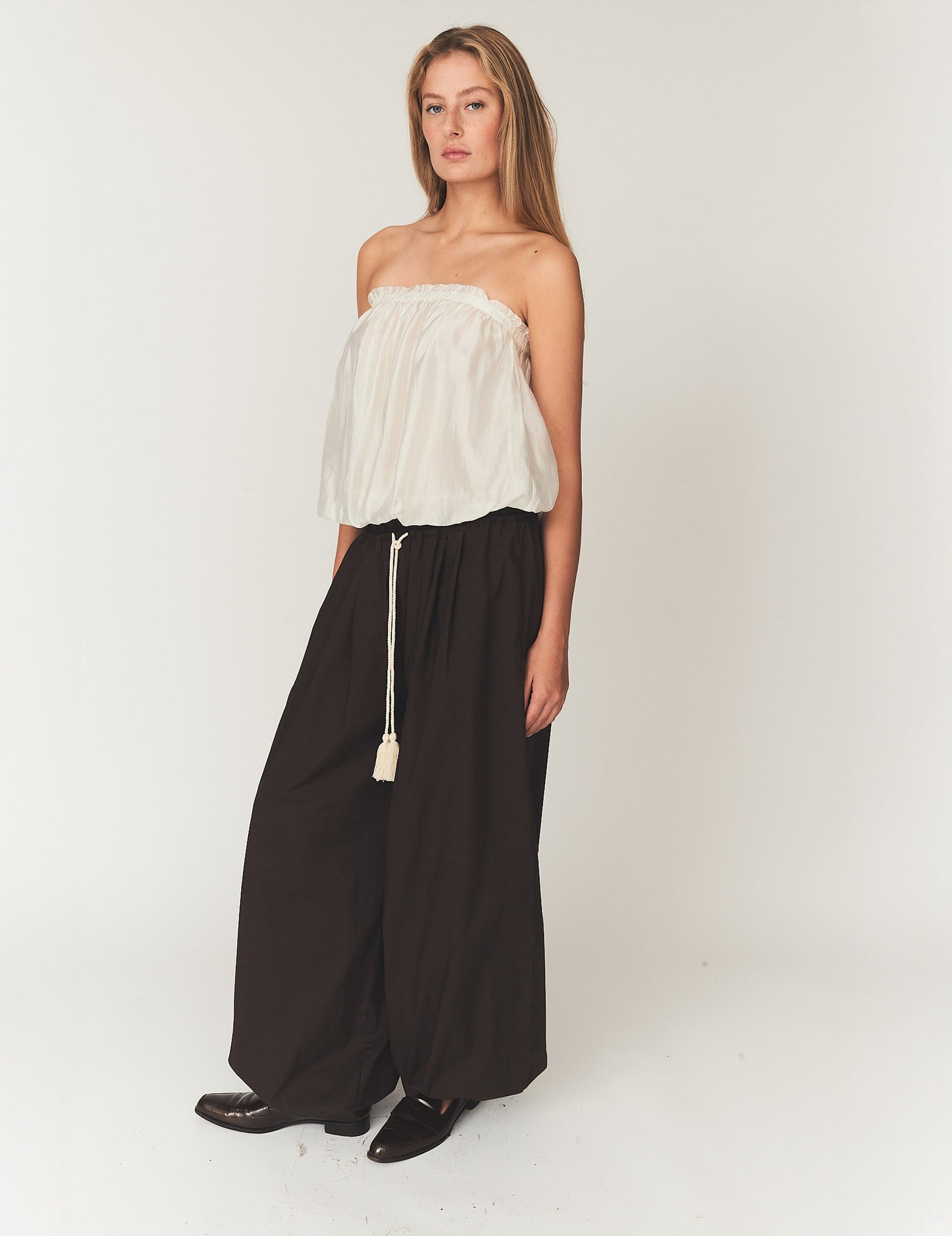The Bazaar Pants bring relaxed elegance to tailored dressing. Voluminous in shape and finished with tassel tie strings, they offer movement and playful, contemporary detail.