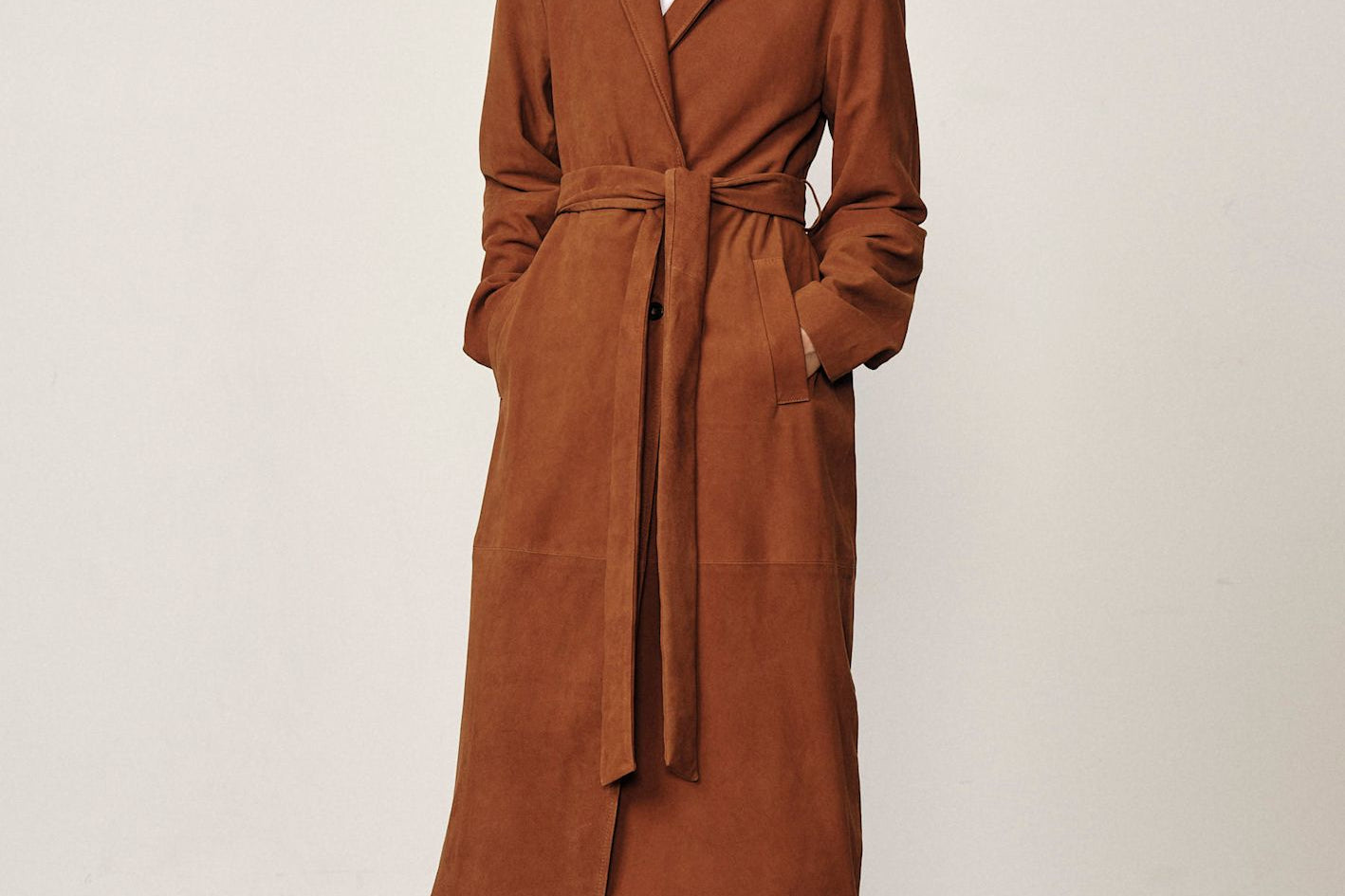 A long lamb leather coat with bold shoulders, a two-button closure, and a waist tie to cinch the waist.